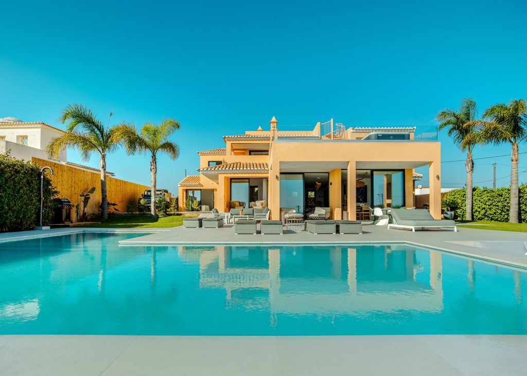 This stunning coastal villa in Albufeira offers the ultimate in seaside luxury, boasting panoramic views of the Atlantic Ocean. Combining Mediterranean charm with contemporary design, the villa features a saltwater infinity pool and sleek sunbeds for perfect relaxation. A sunken lounge with bar stools by the pool provides the ideal spot for evening cocktails with breathtaking views. Villa Rentals in the Algarve.